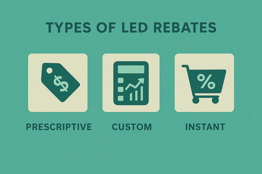 - Prescriptive Rebates – Pre-set dollar amounts for specific LED products (e.g., $15 back per fixture).