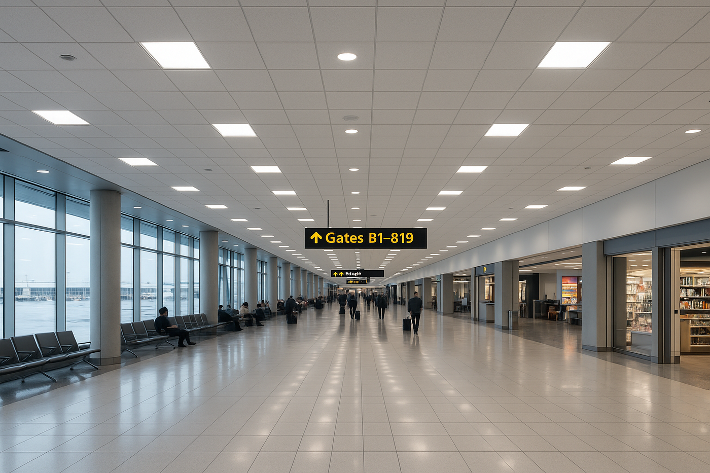 Brighten passenger spaces with LED panels, wafer downlights, and linear fixtures that enhance comfort and clarity. High CRI and selectable CCT ensure clean, uniform light across all indoor zones.